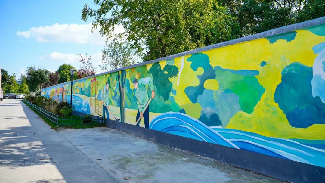 近年来,在农村振兴战略的指导下,肖泾村的基础设施建设和环境改善得到了显著改善。这一次,肖泾村以“五清十美”专项整治为契机,携手上大美院,精心绘制了约1100平方米的“漫游肖泾”墙绘,以四大“浪潮”为主题,打扮成乡村美。