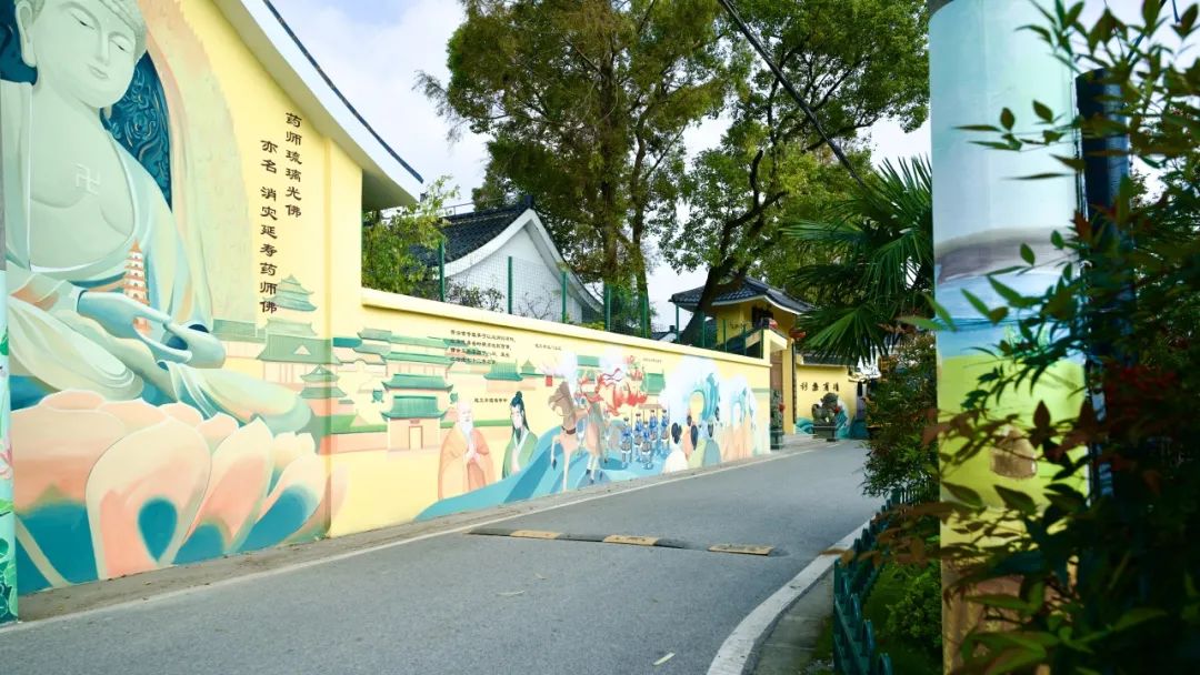 江流田园,乡风民俗,历史人文…” “创意”促使肖泾村的每一幅墙绘都有自己的“艺术范”。“新风貌潮”的主题呈现出和谐的生态,绿意盎然,描绘了人间烟火和乡村风格的新面貌;游轮、生物医药、智能制造等宝山特色产业在“工业浪潮”主题上跃居墙上,突出现代工业力量;“新生活潮”的主题是农村生活的变化,温馨呈现老年人护理、河长制、积分制推广、垃圾分类等场景,传递幸福生活的温度;“历史浪潮”的主题深挖了萧泾古寺的文化内涵。古韵今风交相辉映,历史记忆焕发新生。现代墙绘在艺术与乡村完美结合的同时,也让朴素的村庄焕发了活力。