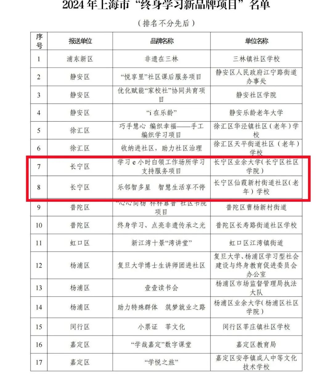 近日,上海市“终身学习新品牌项目”名单于2024年发布,长宁区“学习E小时白领工作场所学习支持服务项目”“乐邻智多星” “智能化生活享受不断”两个项目上榜。