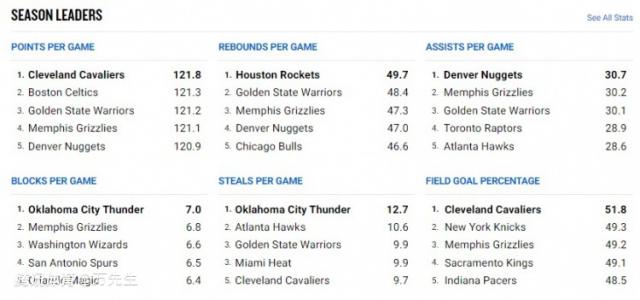 美国媒体晒出了本赛季到目前为止的勇士。 5 项目基础数据排名,均排名前十,4。 项联盟前三名。平均每场比赛 121.2 分数,排在联盟第一 3 位;场均 48.4 一个篮板,排在联盟第一 2 位;场均 30.1 次助攻,联盟排名第一 3 位;场均 9.9 第二次抢断,排在联盟第一 3 位;场均 5.8 第二次盖帽,排在联盟第一 7 位。