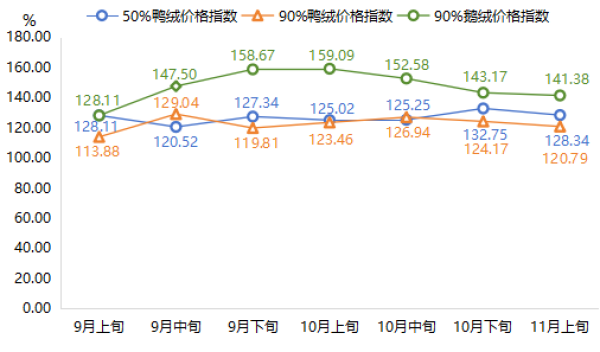 澎湃新闻(www.thepaper.cn)十一月十五日从平湖羽绒服指数简报中了解到,10月中旬、下旬和十一月上旬,羽绒服批发价指数连续30%下跌:10月中旬收于124.92点,环比下跌4.31%。;十月底收于120.88点,环比下降3.23%。;十一月初收于116.95点,环比下降3.25%。