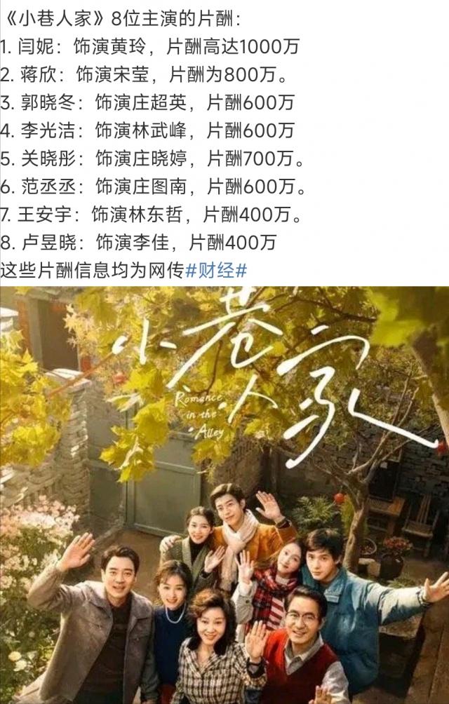 最近网上发布的一部《小巷人家》主演片酬,最高的是闫妮,其次是蒋欣,然后是关晓彤。
