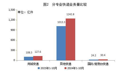 异地快递业务累计完成 1242.8 亿件,同比增长 22.7%;