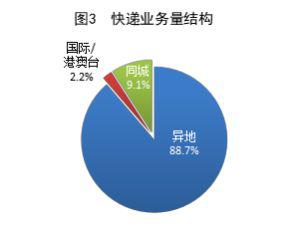 同城,异地,国际 / 港澳台快递业务量分别占全部快递业务量。 9.1%、88.7% 和 2.2%。