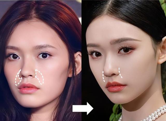 自然,她面部凹陷的处理,要归功于她的面部凹陷。正畸 鼻基底填充这两个关键点。
