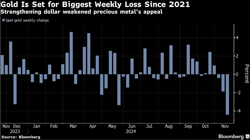 10月31日,黄金创下了约8%的高纪录。特朗普上周获得大选后,黄金价格加速下跌。美元指数已经升至两年高点,市场预测特朗普总统任期将提振经济增长和公司利润。