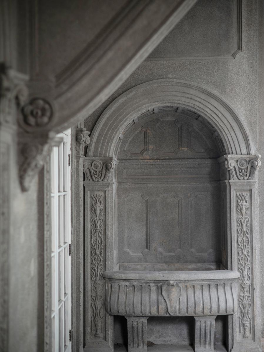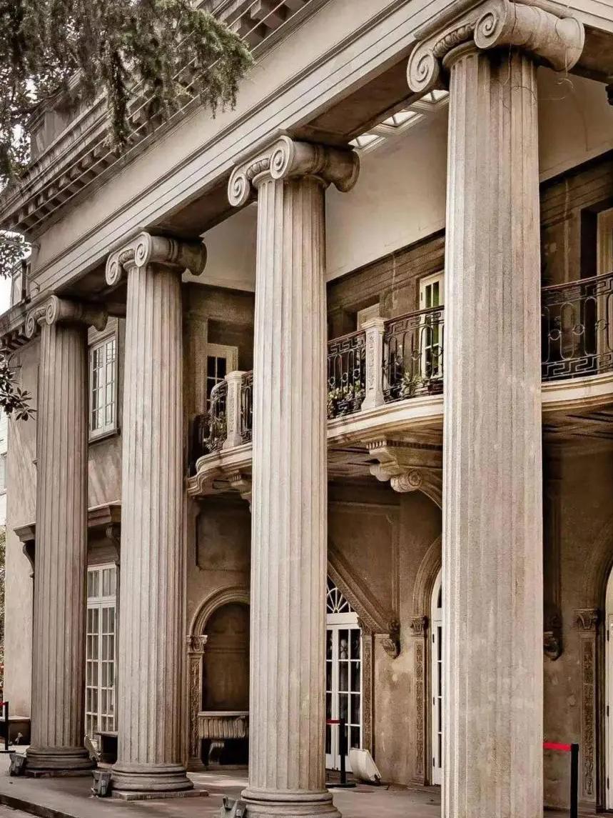住宅南立面设有四根古希腊风格的爱奥尼克门柱,贯穿两层。柱子纤细,边缘有一个小圆面。柱头雕刻着精致柔和的涡卷。柱脚包含复合曲面的线条,上端雕刻,大气优美。