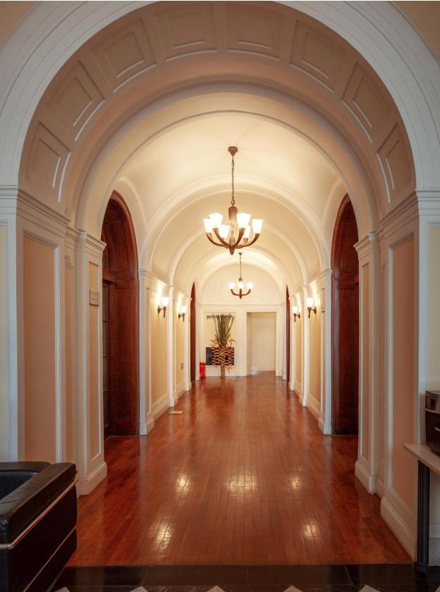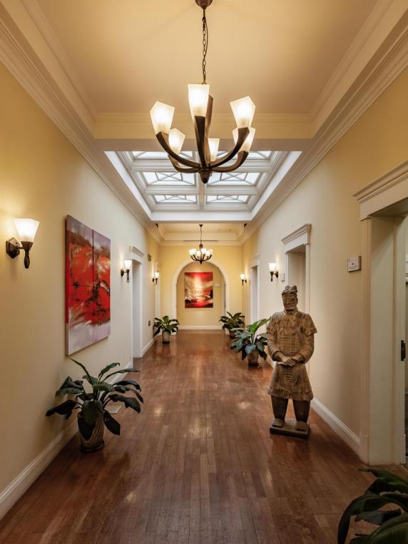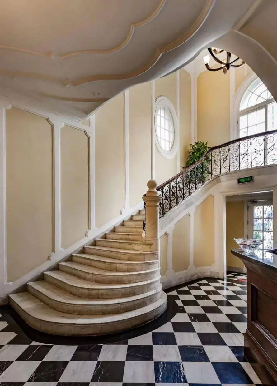 大厅铺着黑白相间的大理石,两侧墙面装饰丰富,墙面印有壁纸。大厅石膏顶部雕刻精美,线脚精致,层次分明。整个底层两侧都有宽阔的自动扶梯,直接通向二楼。