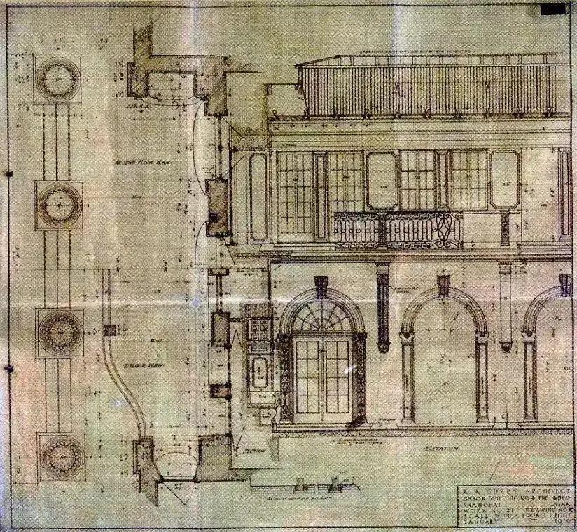 东部和南部两层的弧形阳台由雕刻精美的牛腿支撑。铸铁护栏线条柔和,阳台顶部设计成玻璃天花板。光源透过玻璃天花板后,轻轻地射进屋内,这在上海的旧建筑中是罕见的。