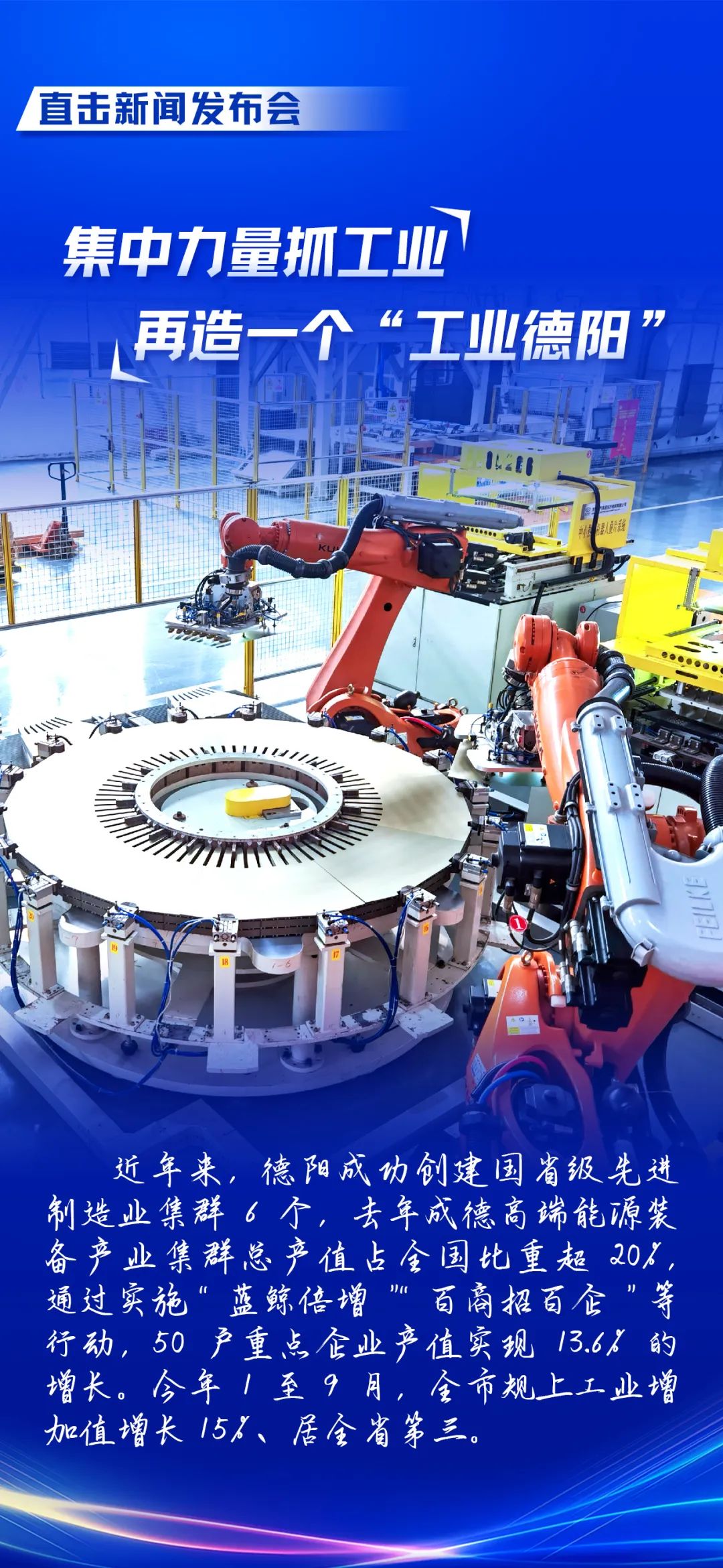 德阳作为一个工业大城市,坚持深入实施工业强市战略,大力推进成渝双城经济带制造强市建设,以工业为重点,以工业为重点。近年来,德阳成功创建了6个省级先进制造集群。去年,成德高端能源设备产业集群总值占全国总值的20%以上。通过实施“蓝鲸倍增”、“百商招百企”等行动,50家重点企业的产值增长了13.6%。今年1月至9月,全市规定工业增长值增长15%、位居全省第三。