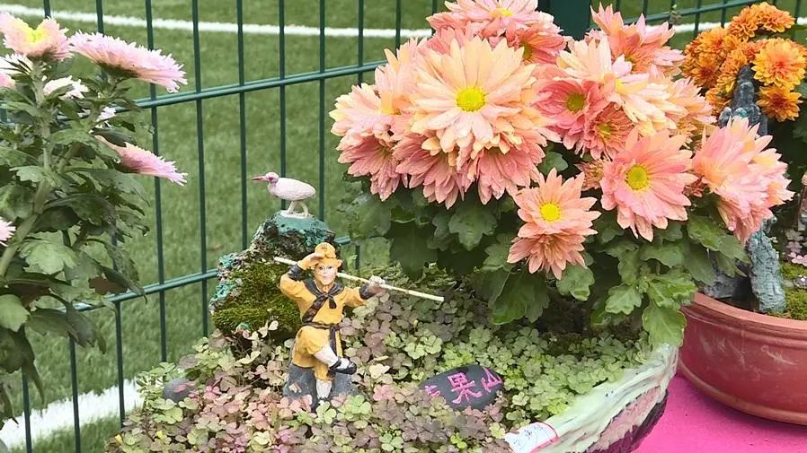 除了菊花盆栽,还有国画班学生提供的30多幅精美的咏菊字画和50多盆园艺盆景和菊花盆景,为这次菊花展增添了一丝古老的魅力。其中,一套以“西游记”为主题的菊花盆景也参加了市菊花展,受到了大众的青睐。