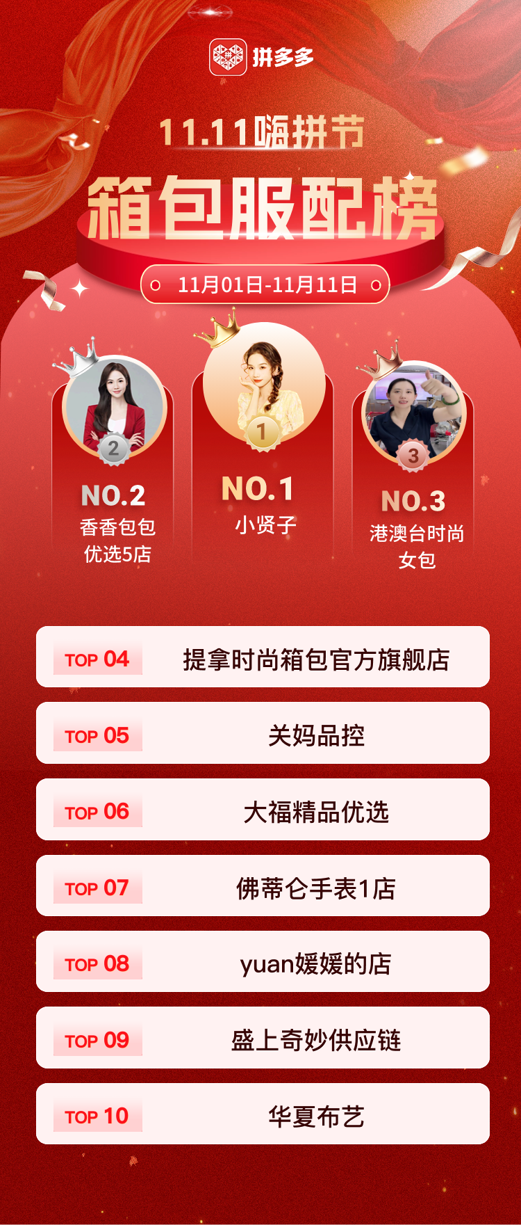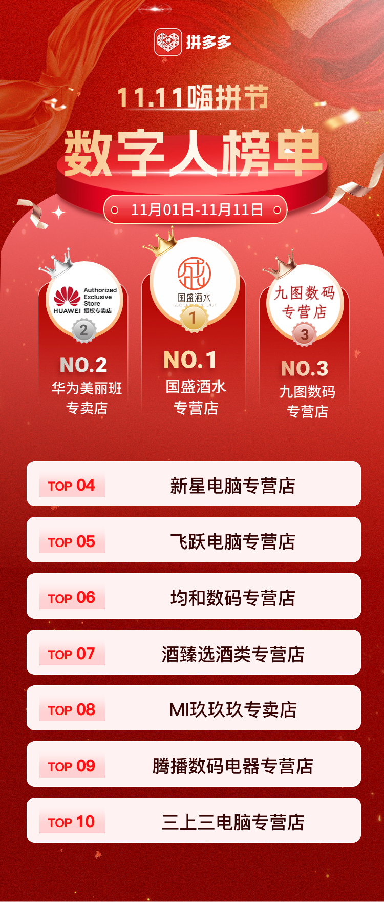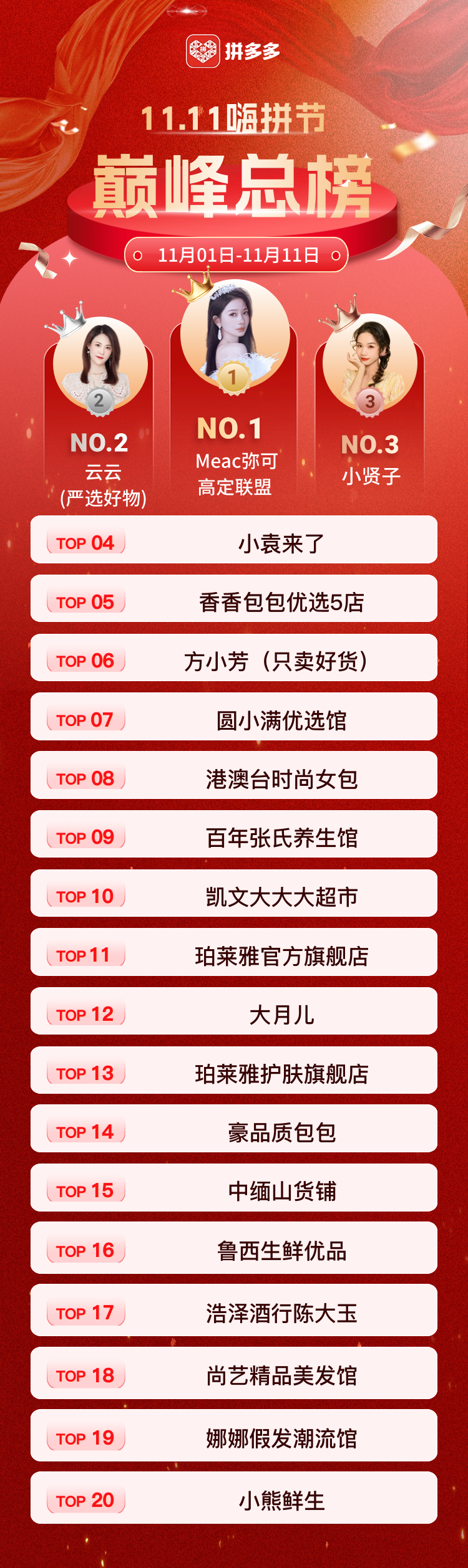 在今年官方曝光的双11榜单前20名中,大部分都是拼多多的达人主播或者白牌店。