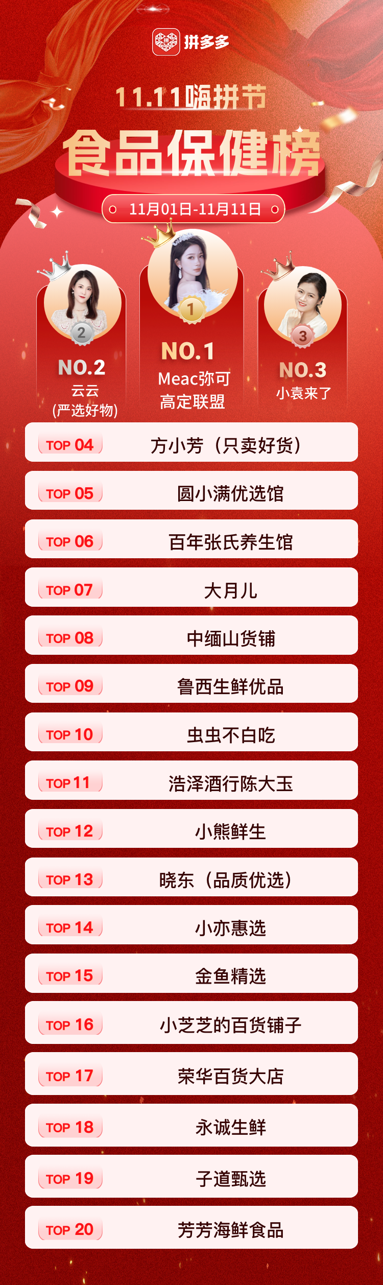 达人Meac弥可高定联盟(严选好货)和小袁在食品保健榜上名列前三。据悉,目前达人Meac弥可高定联盟在拼多多的直播间粉丝超过193万,双11当天在线直播量超过155万。