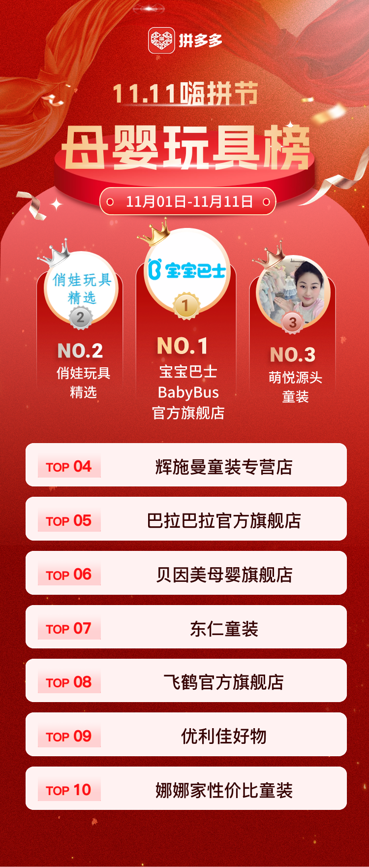TOP3是婴儿巴士BabyBus官方旗舰店,俏娃玩具的首选,萌悦根源童装。其中,双11期间宝宝巴士BabyBus官方旗舰店直播间的主要单品是一款价格在300元左右的点读笔。而且巴拉巴拉官方旗舰店位列拼多多直播双11母婴玩具榜第五。另外,贝因美母婴旗舰店、飞鹤官方旗舰店分为TOP6和TOP8。