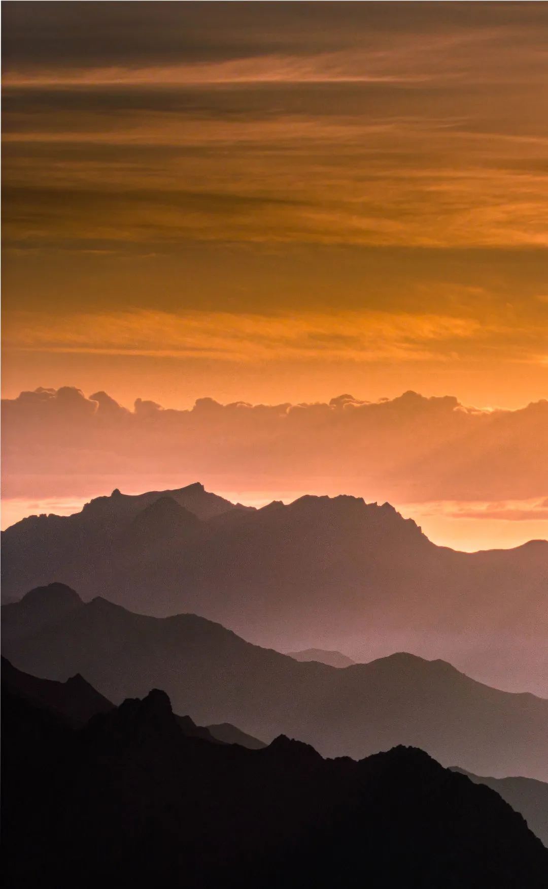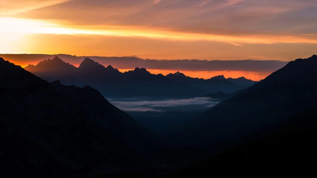 第二折,夕阳达到了极致的辉煌。橙色、紫色和红色交织碰撞,生成发出灿烂的光芒。与此同时,黄龙的土地也被映衬得五颜六色。