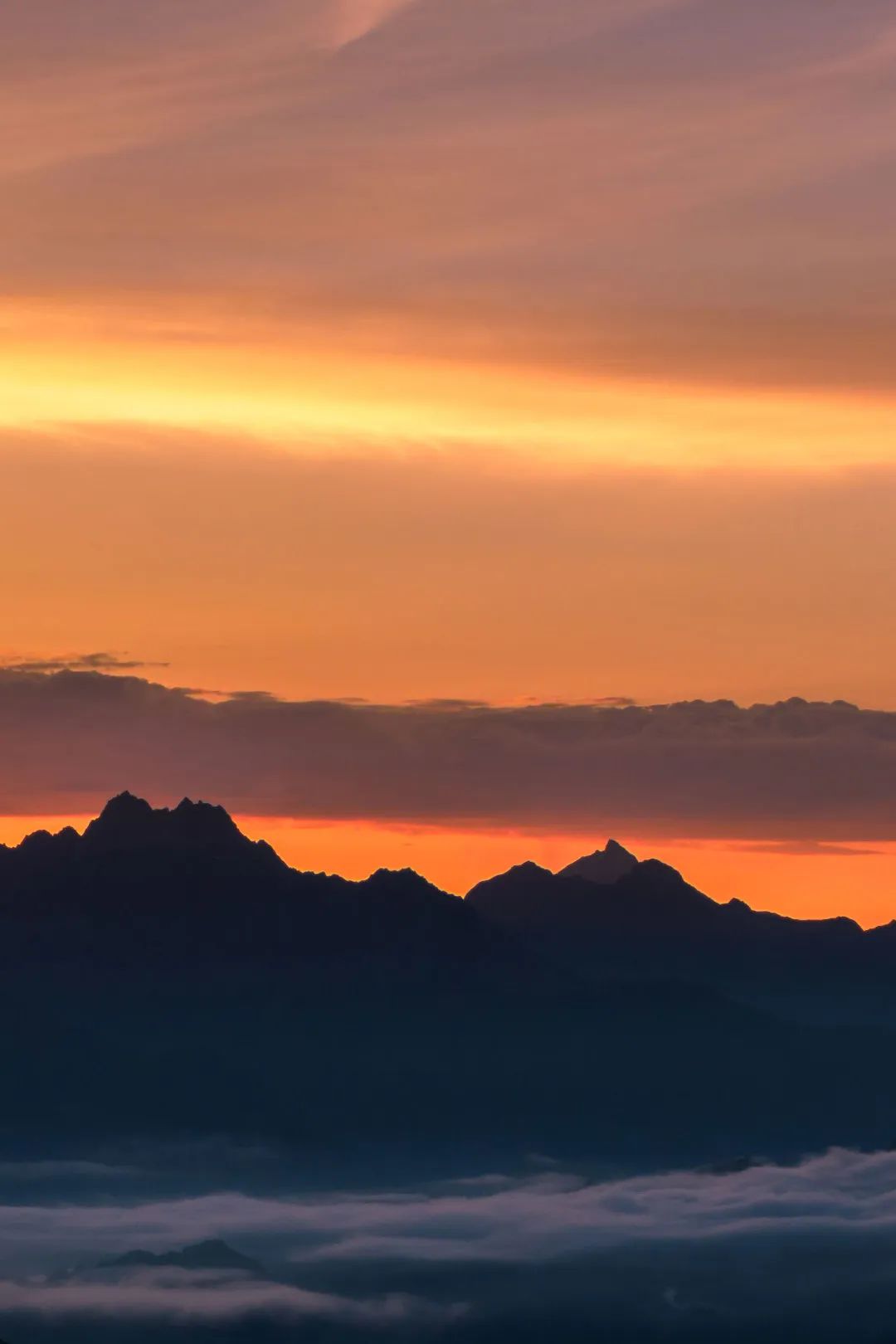 早晨的第一缕微芒悄悄地探向黄龙,朝霞的“三折叠”美景便在空中缓缓展开。