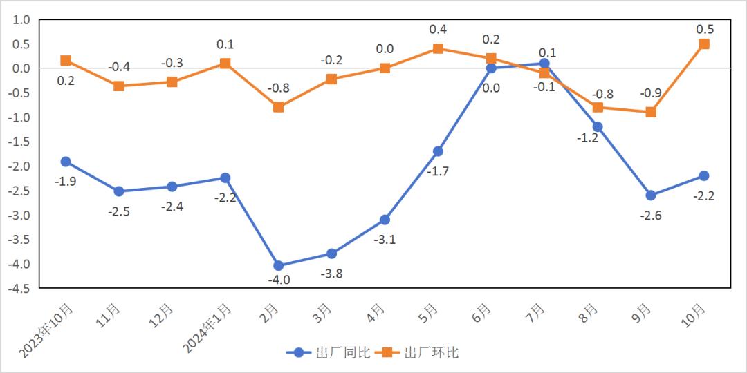 图1 广西工业生产商2023年10月至2024年10月出厂价格涨跌(%)