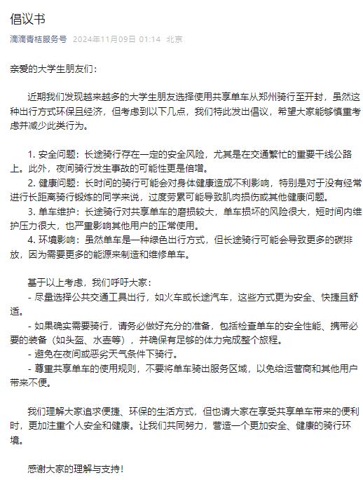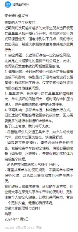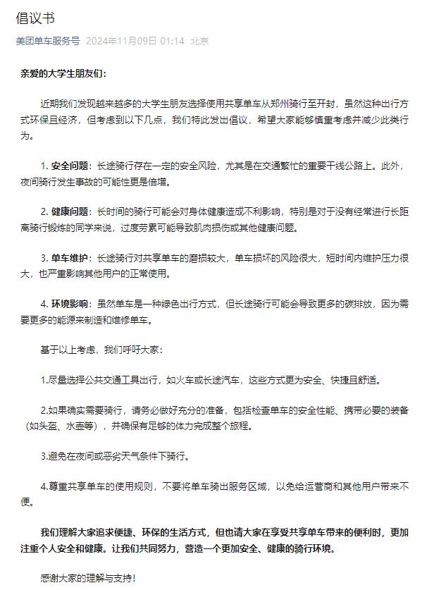 但是这种举社会力量的后勤保障并不能每次都发生。十一月九日下午,郑州和开封先后发布了《交通管制通知》:自2024年11月9日16时至10日12时起,决定禁止郑开大道郑州段非机动车道。一些景点也恢复了预约限流机制,旨在清理非机动车道的自行车共享。十一月九日,美团、哈罗、青桔三大自行车平台发布了自行车倡议书,呼吁大家选择公共交通工具,谨慎出行。