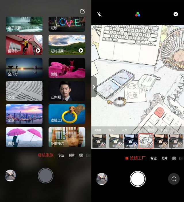 而且系统内置的滤镜非常丰富,托尼简单的数了一下,光是它这个所谓的滤镜。 " 滤镜工厂 " 里面有滤镜 71 一个。。。在默认的拍摄模式下,选项中也有选项。 13 一个滤镜可以选择。
