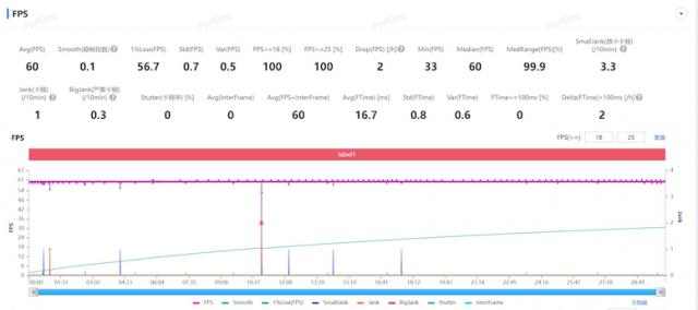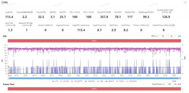 在插帧模式中, 30 每分钟平均帧数为 115.4 帧,存在一定的帧率波动,但是实测温度 47.3 度,也没有给排热带来太大的压力。