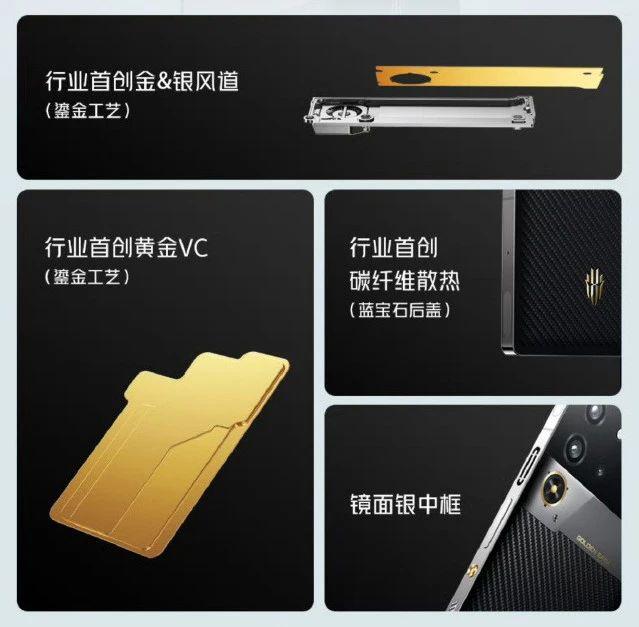 蓝色宝石玻璃后盖,金色 & 银制作风道,黄金制作风道 VC 排热, POWER 键和 LOGO 等待几个地方也做了镀金处理。