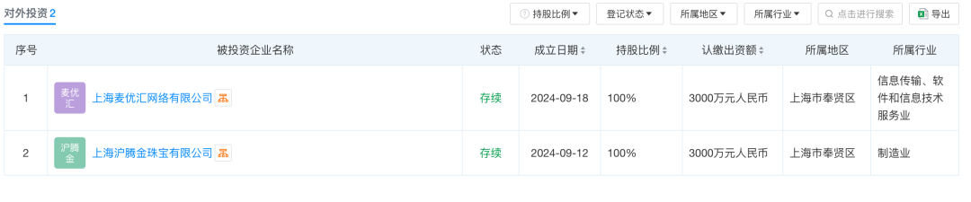 天眼查显示,麦多多隶属于上海麦个购网络科技有限公司,成立于2024年4月23日,注册资本1500万元,法定代表人陈凯文,注册地在上海,经营范围为网上销售;服装批发;鞋帽批发零售;珠宝批发;化妆品批发;个人互联网直播服务等。它拥有两家控股子公司,分别是上海麦汇网络有限公司和上海沪腾金珠宝有限公司。目前,这三家公司都处于生存状态。