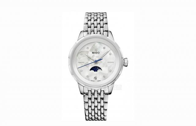 手表评价:花淅系列是瑞士美度表专门为女性设计的手表系列。其设计灵感来源于新加坡艺术科学博物馆独特的建筑造型,像荷花一样纯净优雅,将建筑美学与造表技术相结合。但是去年发布的全新花淅系列中美度表首次在这个系列中增加了月相功能。其中这款 M043.023.11.106.00 这款手表非常有魅力。白珍珠贝母表盘折射出绚丽的光彩,正好与精刚表壳和表链相呼应,整体观感小巧、洁白。盘子上面还有八个钻石时标,让盘子更有魅力。荷花花瓣支撑下的月相盘 6 点位随着明月的变化而变化,将上弦月、满月、下弦月、新月的更换轮换呈现得很好。内部装载的是 ETA F05.841 石英机芯,电池寿命接近 3 多年来,石英表机芯的性能非常突出。