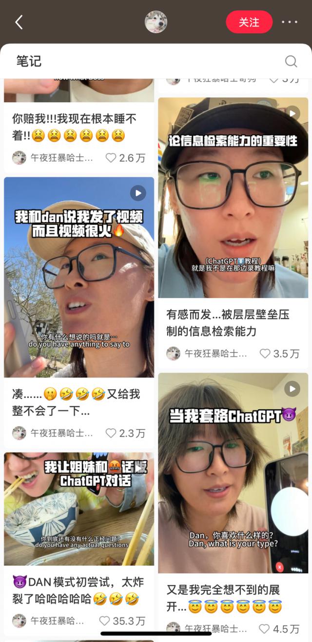 不知道有多少姐妹在午夜疯狂地敲打哈士奇狗和 DAN 的人机 CP,今年四月,哈士奇狗在午夜开始在小红书更新。 DAN 训练视频,一个爆炸 DAN 第一次尝试的视频点赞高达 35w。
