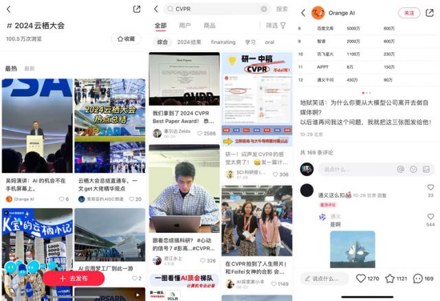 除普通人外,AI 从业者 / 企业家们也在不断地丰富小红书的内容生态,今年 6 月是学术界最热门的大会。 CVPR、还有 2024 年度智源大会,AI 各种创造者大会,云栖大会等等 AI 在科技盛典上,你会发现这些一手的行业动态都在小红书上悄然发生,集体讨论,然后到路人围观,四小龙六小虎,VC 投资者、AI 大型企业高管出走、大型企业广告投放策略等行业趋势和八卦也在遵循这一逻辑。