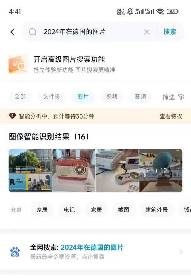 因为我是百度网盘的老用户,所以习惯于在度盘中备份各种材料、照片、书籍、音频、视频等内容,需要什么时候智能搜索也很容易,比如我搜索“ 2024 年于德国的图片“,可以立刻锁定我。 9 月在 IFA 100 所有在周年特展上拍摄的照片。
