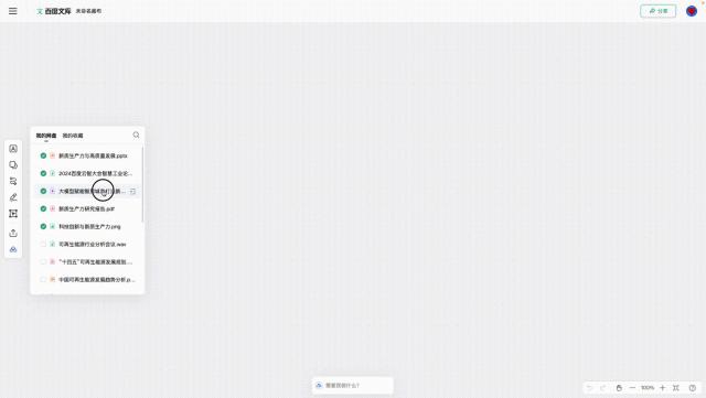 还可以对各种文件进行各种文件 AI 比如让步,编辑 AI 提取一份稿件的核心内容,提醒同事要注意,例如让同事注意, AI 给予数百页新能源白皮书 PDF 生成思维导图与同事分享。而且我可以和后台的同事分享免费画板的项目链接。他们可以直接查看不同的材料和编辑过程。如果我授权,他们也可以进行第二次编辑。