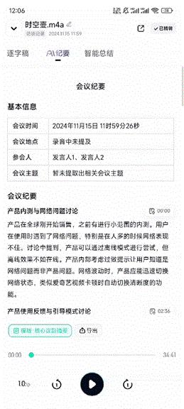 比如德国柏林的报道 IFA 2024 当时,我在嘈杂的展区和时空壶里。 CEO 田力进行了交流,用“简单听记”, 40 分分钟录音,导入后只需录音。 3-4 可以在几分钟内快速生成逐字稿,同时还可以得到 AI 纪要和总结版本。