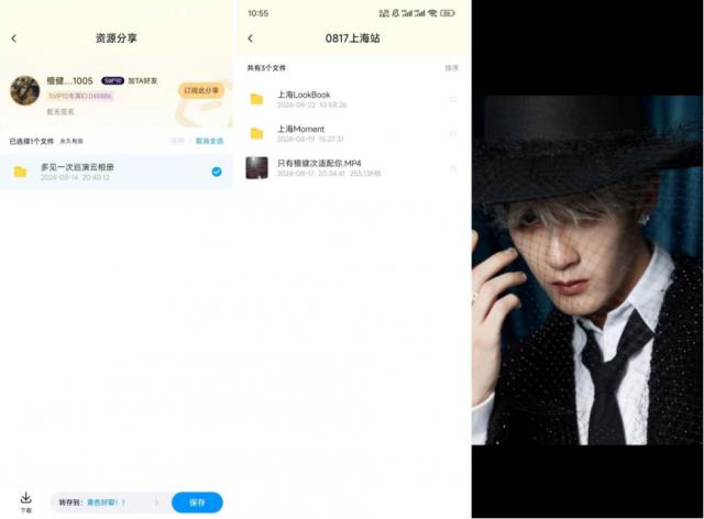 说实话,我自己也不是偶像化的,但是公司里有一个为偶像疯狂的女同事,每天都在高韧性的关注社交媒体收图,甚至去二手平台买别人整理的图片、美图、材料,什么都懂。现在,百度网盘实际上已经成为她的“营养来源”,因为包括她的爱豆在内的明星们自发地用百度网盘分享个人资料。比如前阵子檀健次直接在上海演唱会上投了一个二维码让粉丝当场扫描。扫完之后,他跳出了一个熟悉的百度网盘界面,里面有很多现场照片,还有一个他在舞台上自己拍的视频。