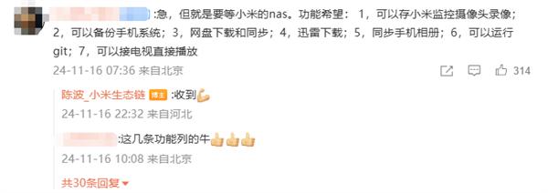 同时,他还列出了七个功能,希望小米 NAS 可以支持,包括可以存储小米监控摄像头的视频,可以备份手机系统,下载和同步网盘,下载迅雷,同步手机相册,运行。 git、可直接接电视播放。