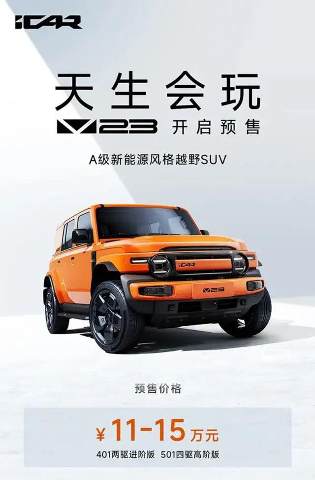 奇瑞在广州车展期间 iCAR V23 新车宣布开始预售,提供 401 高级版和两驱 501 四驱高级版两款配备,预售价格为 11 万 -15 万元。