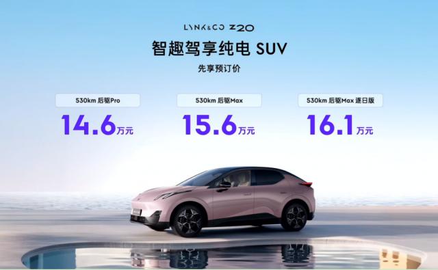 11 月 15 日本,领克与其全系列车型一起亮相广州车展,并开启纯电动汽车展。 SUV 领克 Z20 国内首秀及先享预订。这次共同推出。 530km 后驱 Pro、530km 后驱 Max、530km 后驱 Max 每日三款车型,首先享受预订价格:14.6 万元起。