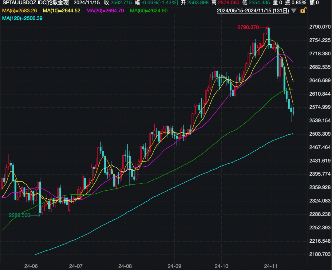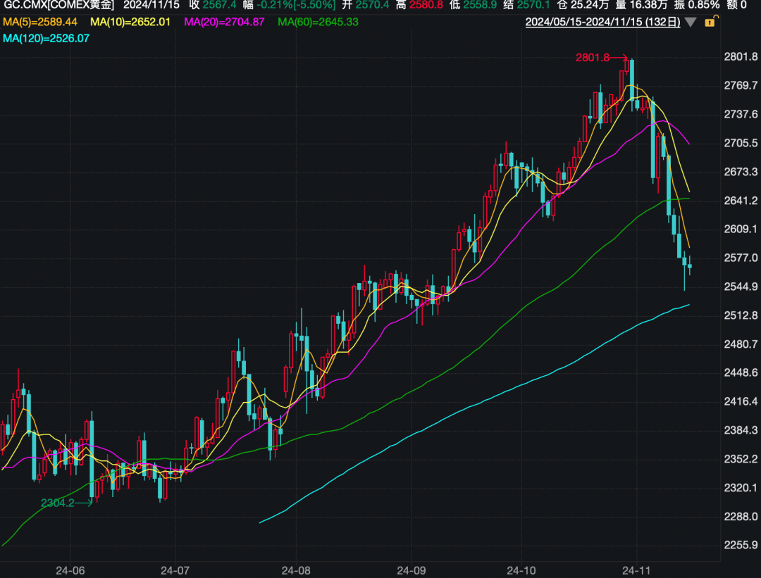Wind数据显示,本周伦敦黄金累计下跌4.52%,收于2562.715美元/盎司;COMEX黄金期货每周下跌4.73%,收于2567.4美元/盎司。事实上,从11月8日到11月15日,黄金价格已经连续六个交易日下跌。