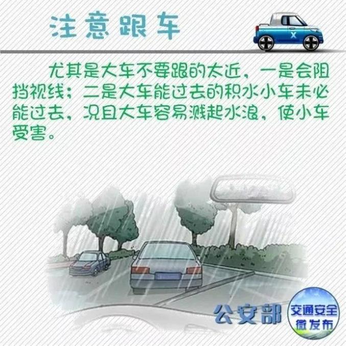 别盲目跟随,大型车可以通过的积水路段,小型车可能无法顺利完成。
