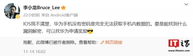 IT 世家 11 月 17 每日消息,华为终端 BG CTO 昨天,李小龙发表了一篇文章,没有密码的华为手机根本无法获取手机内部数据。。与此同时,他还表示:“如果能找到解密的漏洞,可以向华为申请奖励”。