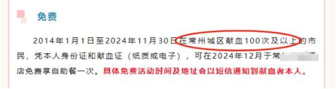 在2014年1月1日至2024年12月30日期间,在常州市参加免费献血的市民,可在2024年12月1日至12月30日期间在酒店享受一次自助餐优惠价格(原价368元/位,优惠价268元/位),凭身份证和献血证(纸质或电子)。同行业成年人可享受一次优惠价格(268元/位)。