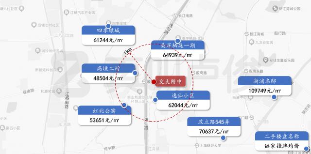 交通大学附属中学周边没有高质量的公立初中小学,更能体现高中对房价的影响。