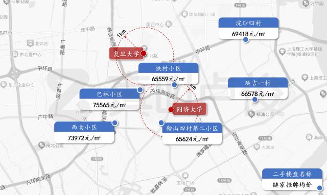 我们还看了复旦大学(邯郸校区)和同济大学(四平路校区)所在的中原板块,以及旁边的曲阳板块。