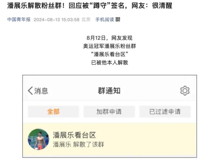 值得注意的是,在8月12日之前,潘展乐为了更多的精力投入到训练中,突然解散了唯一的粉丝群,这引起了社交平台的广泛关注。
