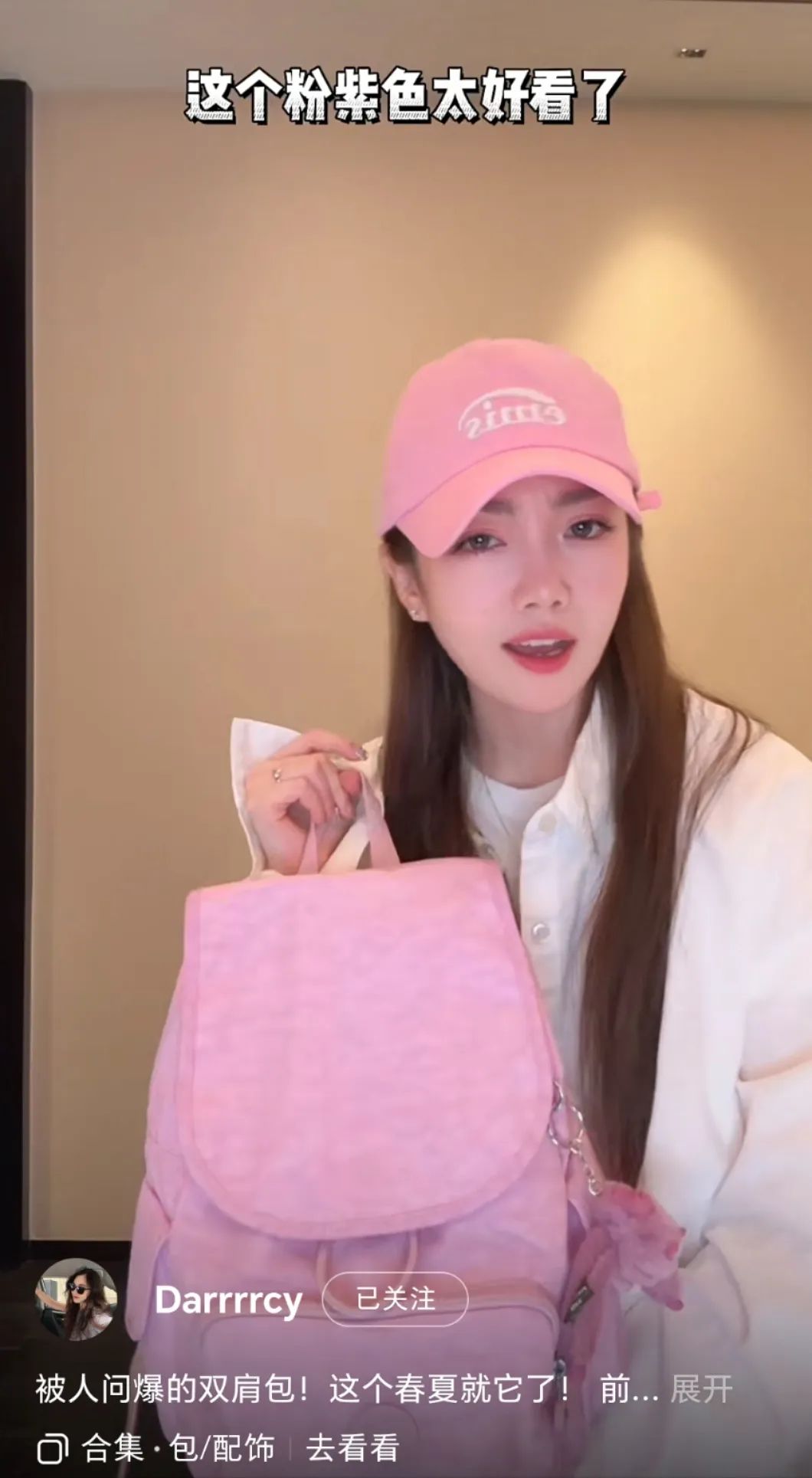 Darcy在一堆包里选出了名叫“妙龄粉紫”的那款,并做了巧思穿搭,克罗心的黑色卫衣,紧身喇叭牛仔裤,粉色帽子,背上撞色包来了一场高铁旅游,将其放到生活场景中去讲使用与搭配的价值——意外洒上咖啡却容易擦的实用性。在她的买手直播间卖爆后,这款包全渠道断了货,那段时间“代购都买不到”。