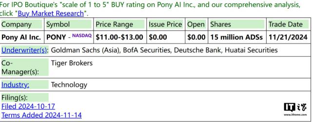IT 世家 11 月 17 日消息,据 IPO Boutique 中国自动驾驶公司小马智行预计将于 11 月 21 日(下周四)正式登陆纳斯达克。