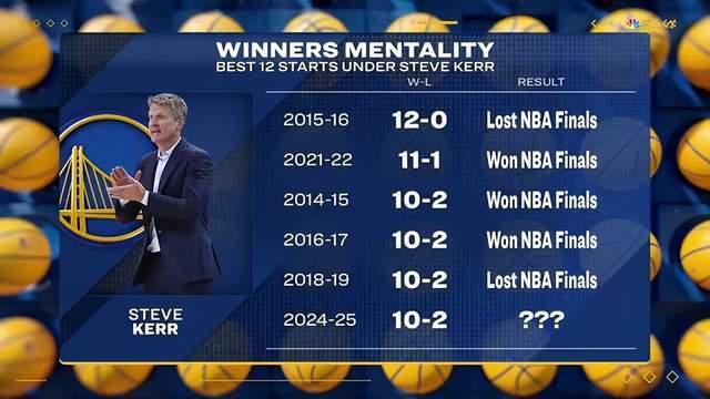 以前由勇士主教练柯尔执教 11 一个赛季,勇士曾经 5 度在开季前 12 至少在比赛中得到 10 胜的佳绩