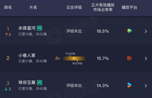 就目前的数据来看,《珠帘玉幕》不仅落后于《永夜星河》,而且被芒果台的《小巷人家》所超越。