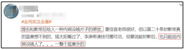 所以在结果公布的时候,不仅现场有观众大喊“内幕”,社交媒体也是一片质疑。有些网友直言:这真是水漫金鸡,影帝和影后都是笑话。对许多人来说,这两个人获奖让人觉得内娱没有好演员。