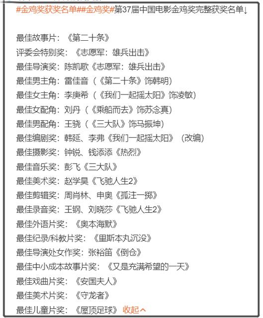 第 37 届中国电影金鸡奖正式落下帷幕,大家都期待着。 20 一个奖项也是新发布的!《第二十条》成为赢家,获得两个奖项:最佳故事片和最佳男主角。最佳女主角被《我们一起摇太阳》中凌敏的饰演者李庚希收入囊中!