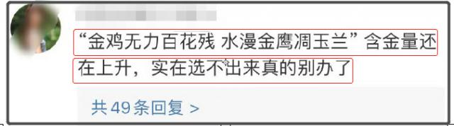 也有网友给出了打油诗:金鸡无力百花残,水漫金鹰凋玉兰。可以看出,每个人都统一了前线,把矛头指向了影帝和影后。